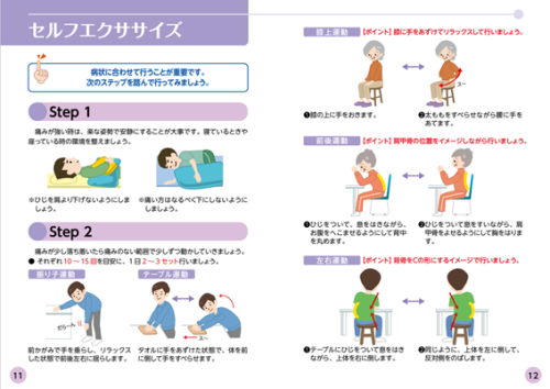 このパンフレットには、痛みの原因や運動方法、生活の工夫などが図を用いて分かりやすく説明されています。